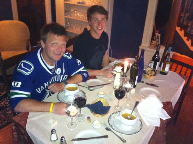 Dinner was delicious, although I’m not sure exactly what it was; some sort of meat I think. We were the only ones at the B&B that night and so we pulled one of the other tables close to us and watched the Canucks win game 5 on my laptop during dinner. My mother would not have been impressed I don’t think!