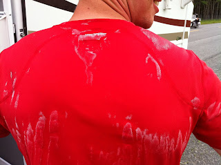 Paul handed lunch out to us at 30km and we continued on a bit while eating. It was now way too hot and we were consuming enormous amounts of fluid. We were also developing pretty awesome looking salt lines all over our shirts.