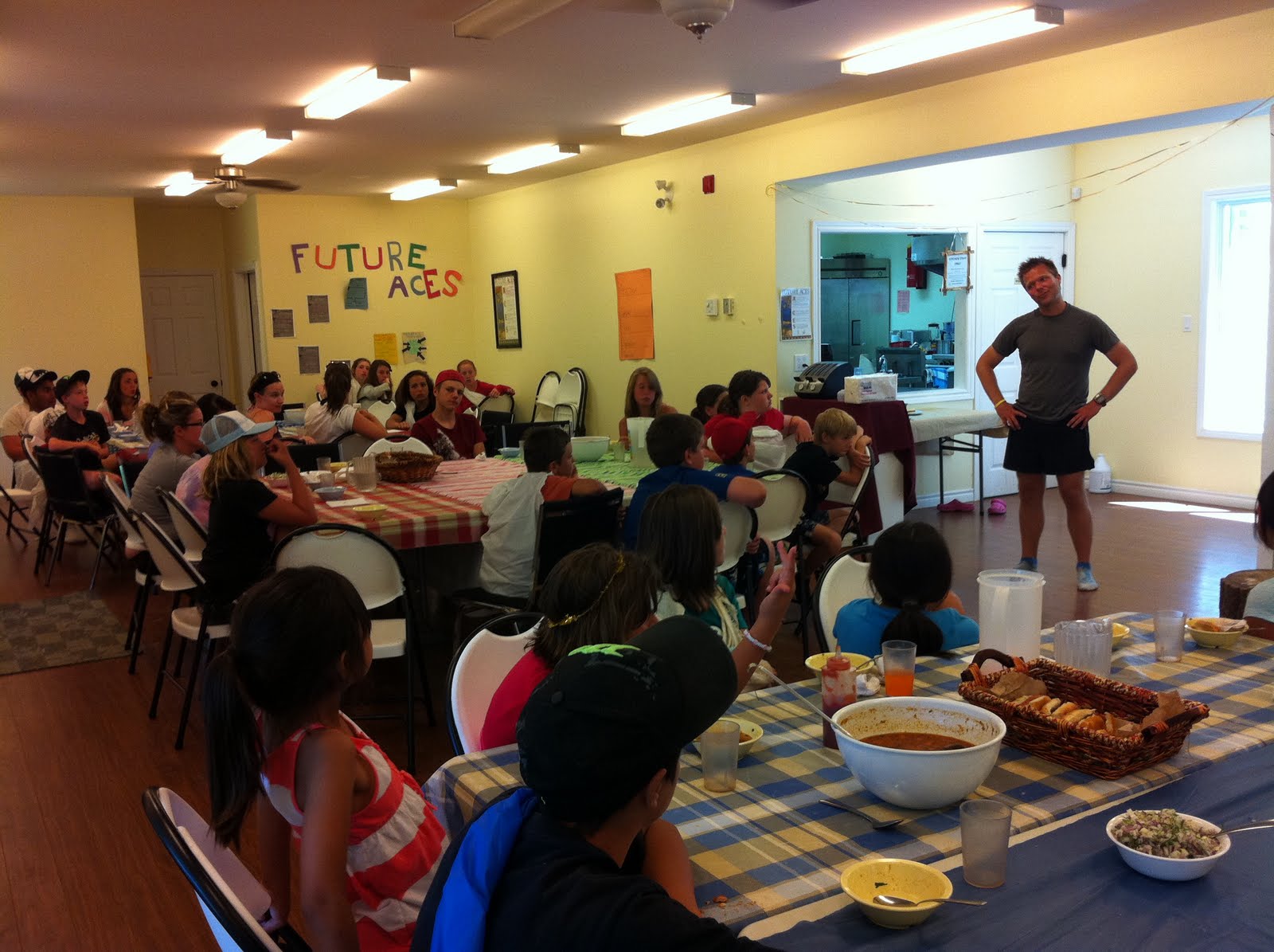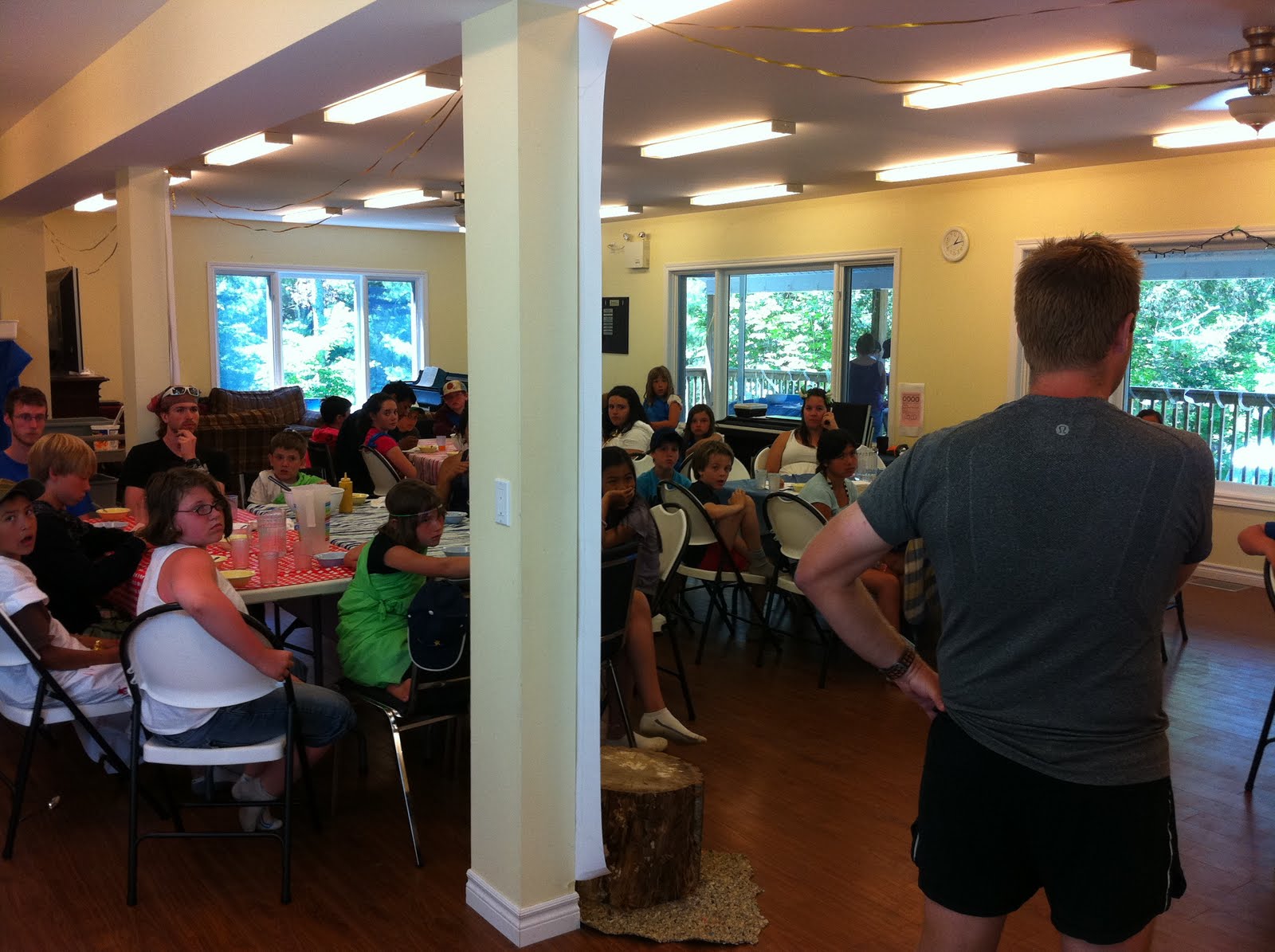 As we walked into the dining hall, we were escorted to our seats at the end of a table facing the hall, full of 80 kids. On the menu: Hot dogs! A true camp food! Riley and I enjoyed chatting to the counselors and the kids about camp and the different activities etc. After the meal, we were kindly asked to do a short talk about Riley's run.