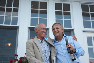 The celebration took place at the Royal Lake of the Woods Yacht Club. Two life size cardboard cutouts of Rod and John greeted guests. The sun continued to shine upon us as familiar faces from childhood, high school, university, work, and the lake swarmed the deck for cocktails. Our MC for the night, Don Konantz took to the steps to welcome everyone and introduce the famous birthday boys. With the cheers and singing of Happy Birthday before entering the doors of the Yacht Club it was evident immediately the impact these two individuals have had on the lives of their guests. A delicious carrot cake designed with the famous Step Into Action Finger and 65 candles was presented to the birthday boys.