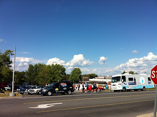 It was a beautiful morning and having two days off has done wonders for my legs. The terrain complied as well today and was mostly flat with more downhill than up. Despite the fact that it once again got really hot I found myself ahead of schedule. I was to meet up at the Kenora Jail at 4pm with members of the classic car club and friends and family who were going to run with me through Kenora to Husky the Muskie. I made it to only 15km from the jail by 1pm so I stopped and had lunch and a nap before starting up again.