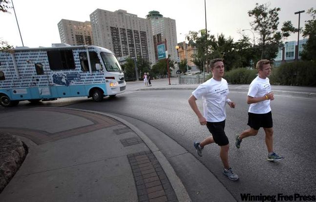 I finished in the parking lot across from the Human Rights Museum. A couple of guys came over to chat with us and the three of us tried unsuccessfully to convince the two of them that I was running across Canada. They were convinced it was a joke!