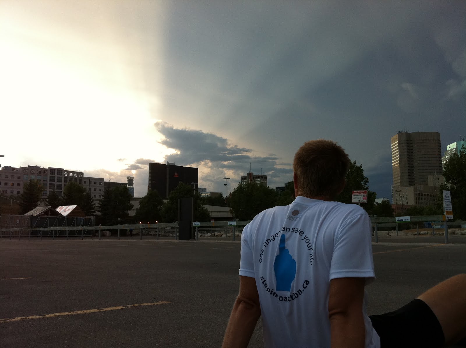 I finally made it the city limits and saw the Welcome to Winnipeg sign. I was too tired to notice anything, but Mike was running with me and noticed a cardboard sign had been taped to the welcome sign. We walked over and saw that it was a giant blue hand with the index finger extended and the words Step into Action typed on it. On the back was a message from my cousin Joey who had driven out and put the sign up. It was awesome and helped motivate me to keep going. The run into Winnipeg was nice because pretty soon I recognized where we were and was able to run on the sidewalks towards the Forks.