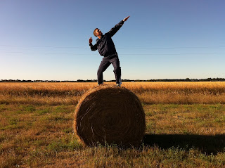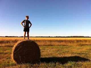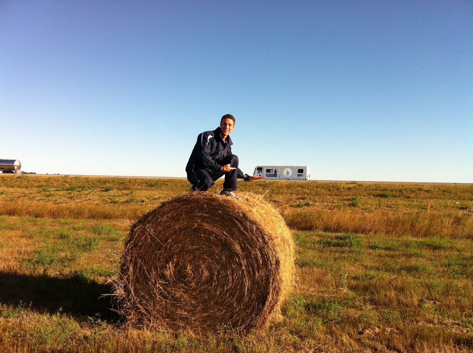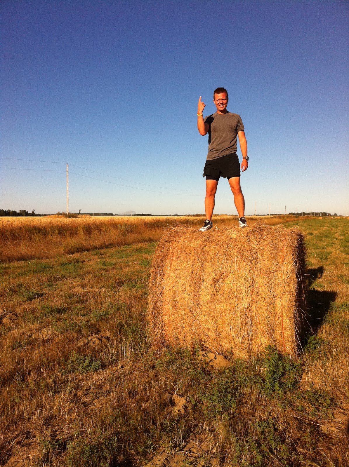 It was cooler this morning, a nice change especially now that our A/C is gone. Shortly after I started running this morning (which happened to start at the bottom of a hill, so much for the prairies being flat) hay bales started appearing in the meridian dividing the highway. No longer guarded by fences Mike and I immediately started playing on the first few we saw, taking what we considered fairly artistic photos.
