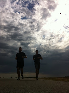 While I was running alone I managed to finish listening to 1984 and have started listening to Predictably Irrational. It seems pretty good so far. The tailwind actually got stronger as the day went on and I ended up running into what looked like two separate storms colliding above me. There was tons of lightening and Chris managed to get some pictures of Mike and I running with lightening in the background.