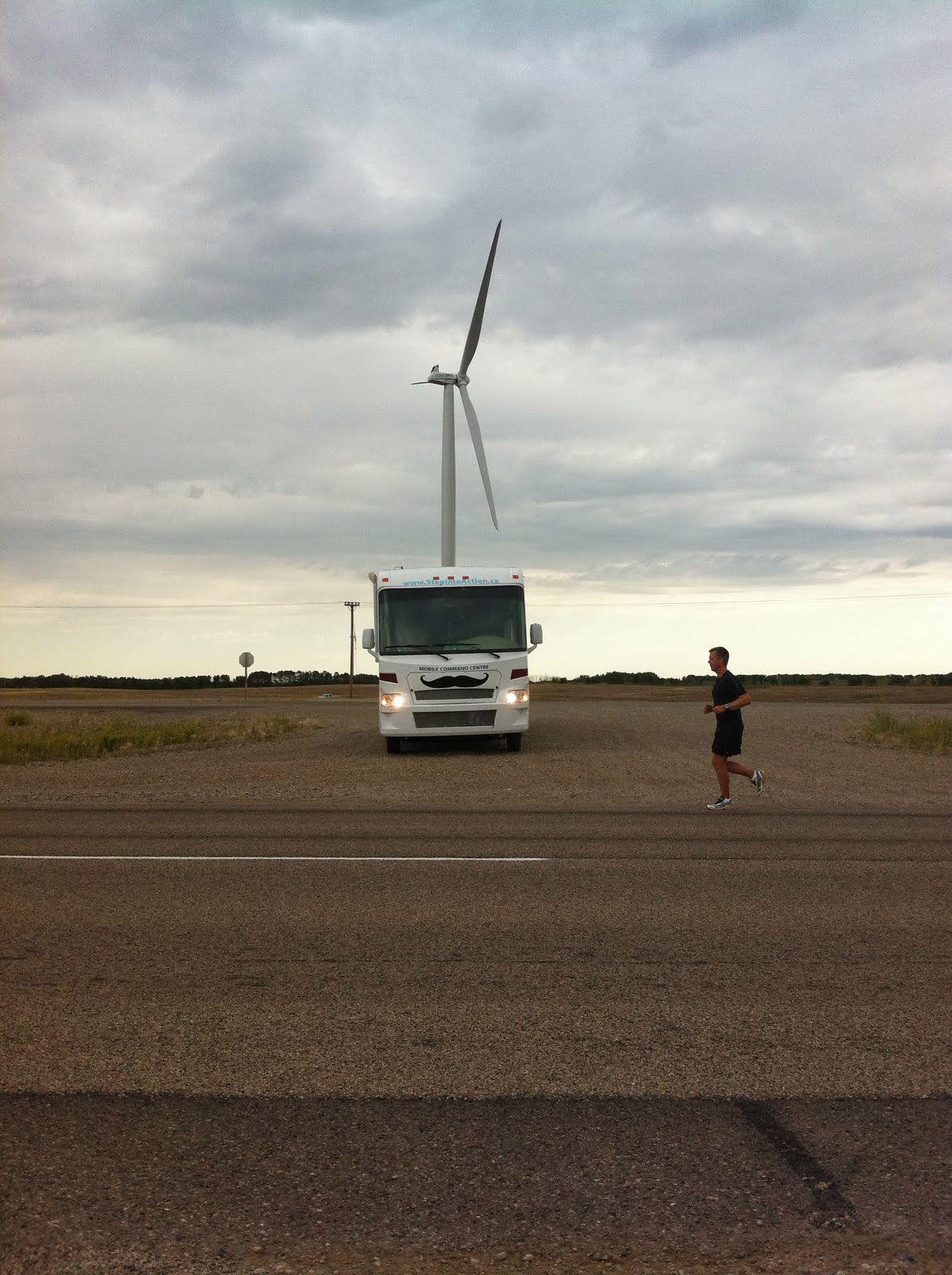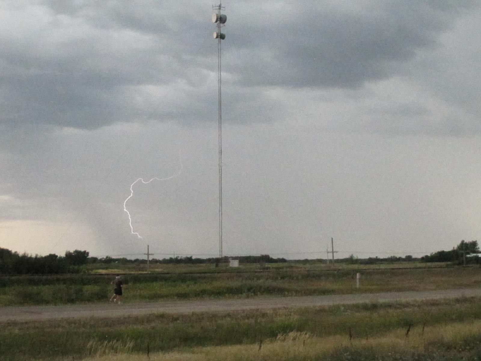 While I was running alone I managed to finish listening to 1984 and have started listening to Predictably Irrational. It seems pretty good so far. The tailwind actually got stronger as the day went on and I ended up running into what looked like two separate storms colliding above me. There was tons of lightening and Chris managed to get some pictures of Mike and I running with lightening in the background.