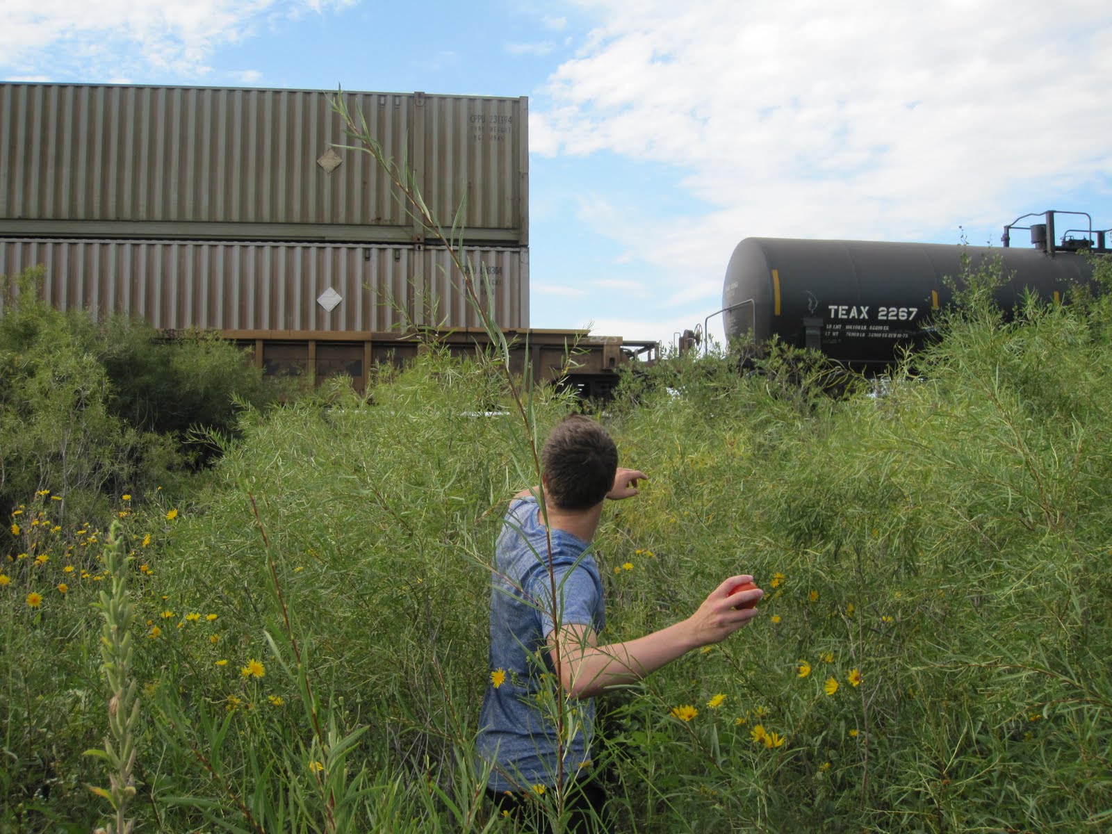 Chris then came down to investigate the wreckage with us and take a few photos. Just then, the sound of a train came rolling in. We all looked at each other and knew what to do. We each picked up a handful of tomatoes and stood at the ready. As the engine rolled by, we waved at the conductor and then waited for him to be out of sight before we started to hurl these red and juicy fruits at the old rusty steel rail cars. We are not against trains, or in any way angry towards the rail system, but just thought it would be a good way to change the routine of our day without doing any real damage or causing any mess. We walked away with smiles and a good story.