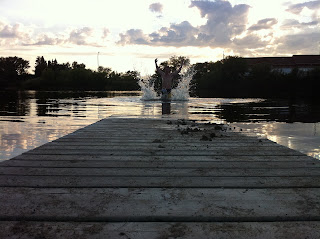 We stopped for the day right next to a very cute little town called Wolseley, which, just so perfectly had everything we needed to complete this day as perfect. First, it had a Rest Stop, which included gas, free dumping, overnight parking and soft serve ice cream (which we all planned on having, but were much too full after my famous stir-fry dinner). Riley needed a shower, but since the towns slogan is "Town around the lake" we went to go find this lake and swinging bridge. It had a quaint little beach and swimming dock into the lake that Chris and I took full advantage of, while Riley showered.