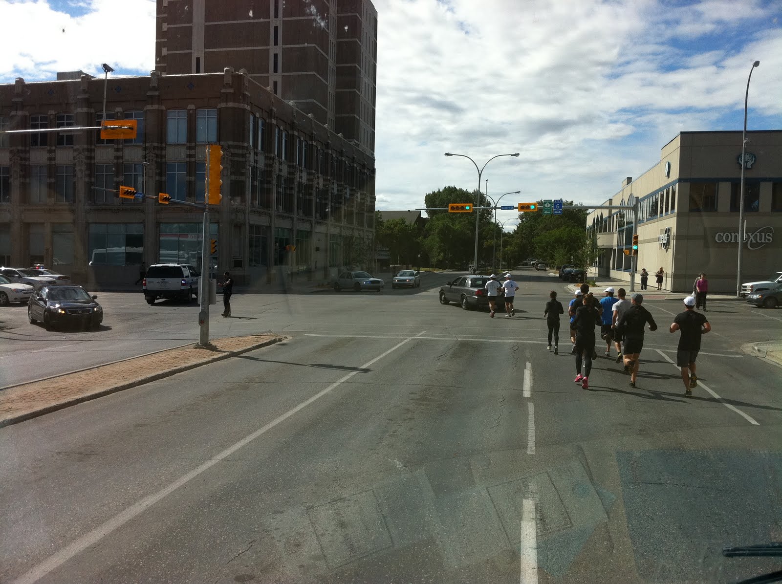 On the way through Regina we met up with a friend of my mother’s Karen, a local schoolteacher, and one of her students Clarence. The two of them joined in and we continued on towards city hall. The run through the city was great and we had a good opportunity to chat with Karen and Clarence.