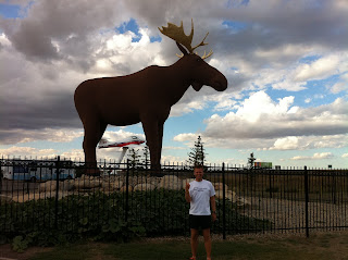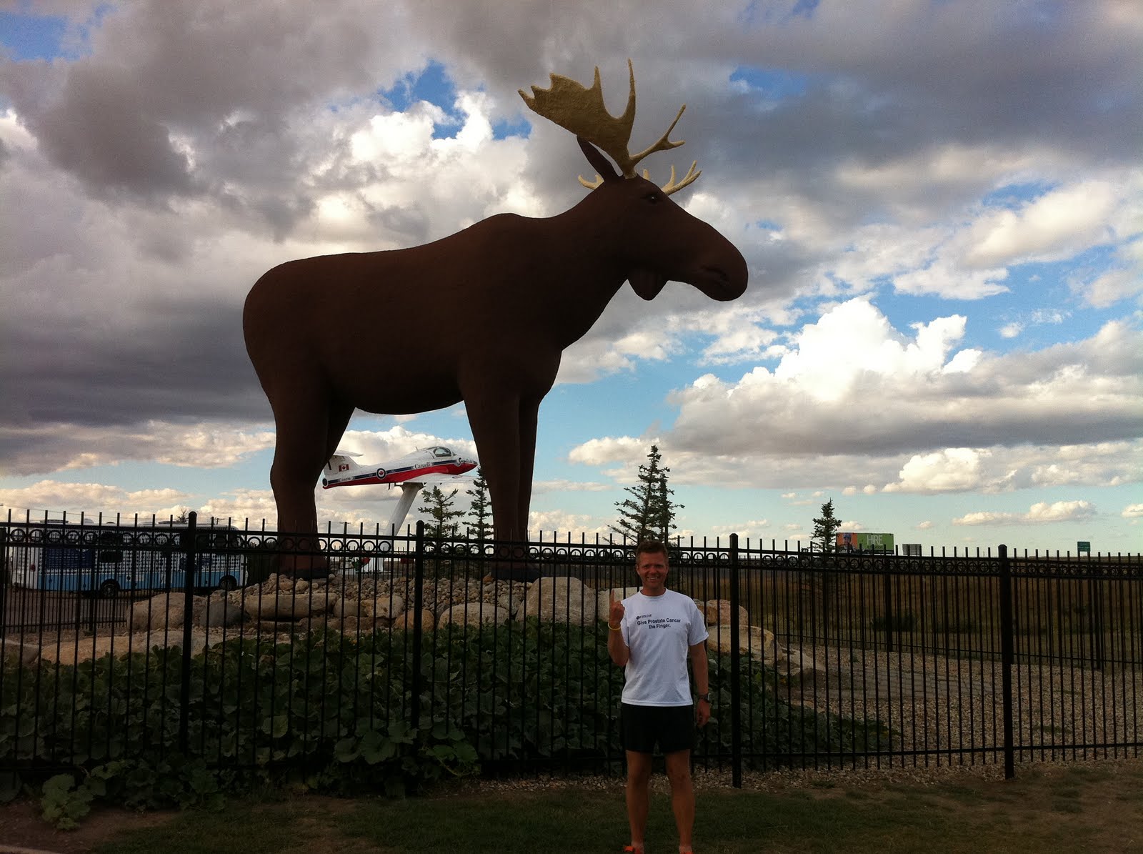 I felt good after our day off and had a faster pace than usual despite the headwind. The road to Moose Jaw was fairly flat all the way until just before I entered the town where the terrain dramatically changed and the road dipped and rose as I passed around. Brett alternated between running with me and hanging out with Mike in the MCC.