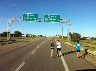 It was hot again today, with the standard Saskatchewan headwind. Jean and Ian took it easy today because they are both going to try and set personal bests for distance tomorrow. By taking it easy Jean still ran 15km and Ian 25km.