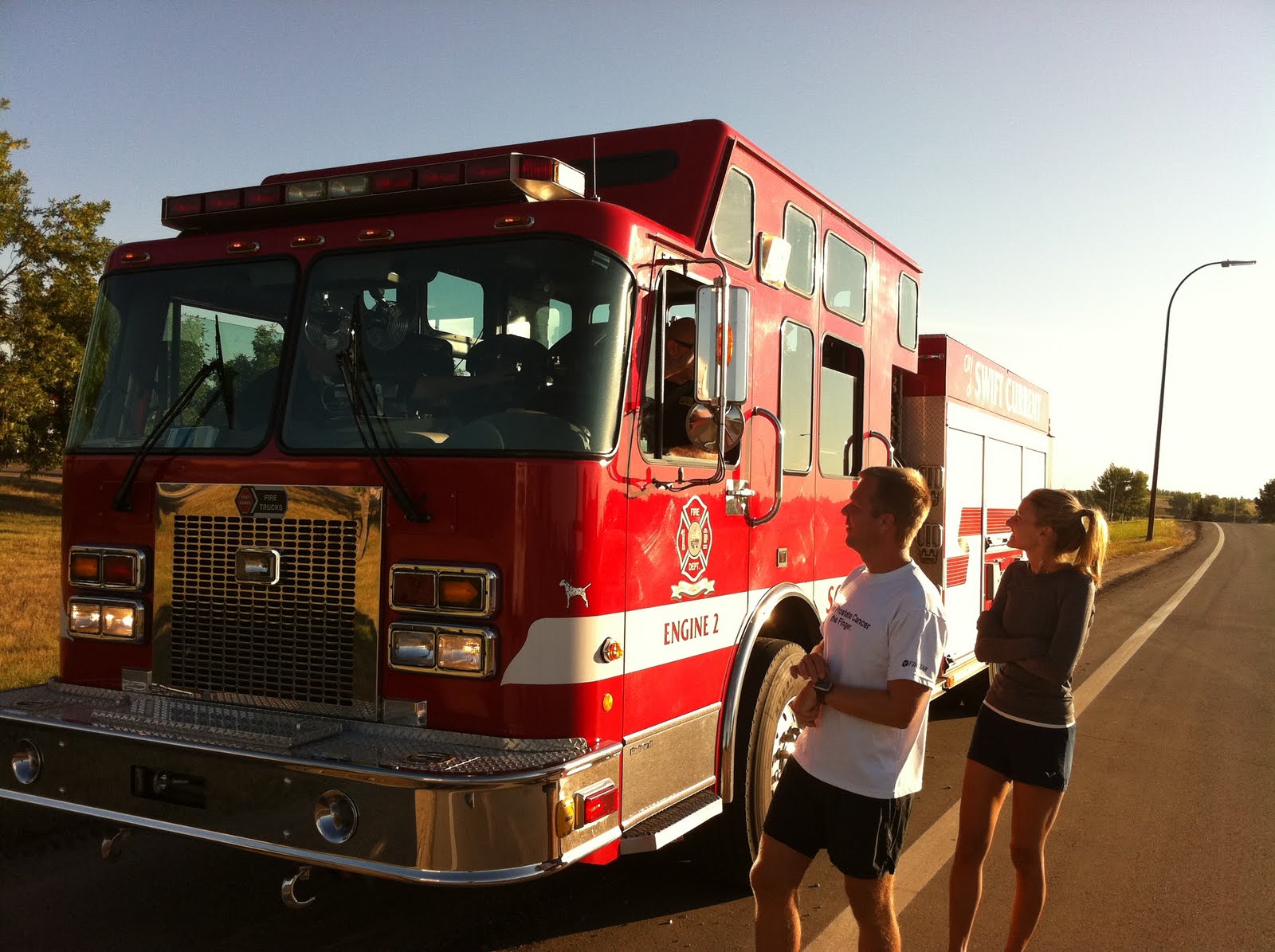 The fire department escorted us through Swift Current, blocking traffic from behind with lights flashing. I love having fire truck escorts. One of these days I want to get in them when their lights are flashing.