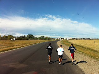 As we were nearing Chestemere, Russ’ friend Chris, a firefighter, came out and ran with us. A short while later a fire truck from Chestemere met us. We continued running through Chestemere and were joined by Mike’s dad and sister. That made five of us. As we approached the Calgary city limits a man with a video camera stepped out of the bushes and began filming us. He didn’t saw anything, just kept running beside us filming.