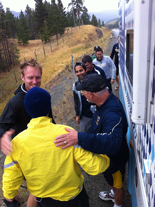 Today started early for the first time in a long time. Tyler was up early on his last day making eggs and toast. I was running by just after 7am and had done 20km by 9:30am. I stopped to give my legs a quick rest and when I exited the MCC to start running again I noticed a black SUV had pulled up behind us. I figured it was someone coming to see if we were ok or to ask about what we were doing, but all at once the doors started opening and I instantly recognized Roger Hatch, my high school rugby coach and Trevor Thomas, a buddy from high school. In total seven people emerged from the car; David Speirs my other rugby coach, Josh MacLean, Rob Snowden, Bryce Quan and Alim Abdulla.