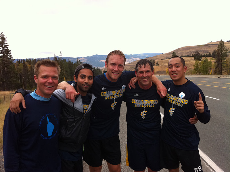 We said some quick hellos and then got back to running, this time with an additional five people. Snowden couldn’t run because he forgot his running shoes back at the hotel and Speirs was driving. They all ran varying distances throughout the day, some running multiple times, others just once. Elaine showed up at some point during the morning to collect Tyler and take him back home to Kelowna. It was awesome having him with us!