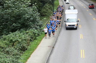 We met at the cauldron around 11:45am and prepared for the run into Ambleside. Shortly after we arrived, a school bus pulled up and 40 Collinwood students and a few teachers began spilling out. They had come to run with me across the bridge into Ambleside. I was also joined by a number of my friends from high school. All in all there were almost 70 of us when we took off from the Cauldron. It was pretty sweet seeing everyone who had come out to run and I was excited to get started.