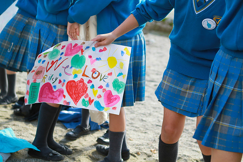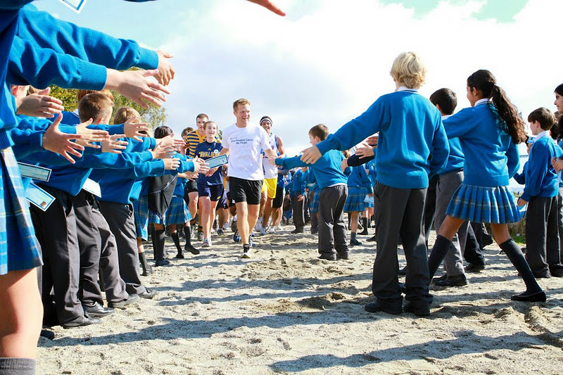 The West Vancouver Police Department had kindly blocked off the short stretch from under the bridge along behind Park Royal to the trail and it wasn’t long before we were through the dog park and running along the beach. As I approached I was greeted by almost all of Collingwood School, grades 3-12. I looked around and everyone was cheering and holding signs they had made. It’s hard to describe the feeling but it was fairly overwhelming as I made my way through the path to the Ocean that was lined with students.