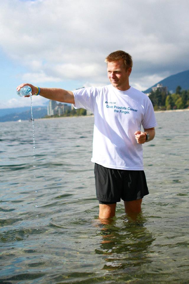 At many points during my run I had wondered what I would actually do when I got to the beach. I had envisioned hurling myself into the water and splashing around but I hadn’t envisioned having over a thousand people watch me do it. So I slowly waded in and poured out the bottle of Atlantic water that I had collected at Cape Spear and carried with me throughout the run. When that was done I wasn’t sure what to do next so I began walking out of the water, but I didn’t get very far. Derek, Mike and Russ came running in and tackled me back into the ocean. So I got my dunk in the water after all.