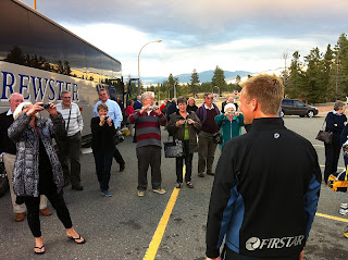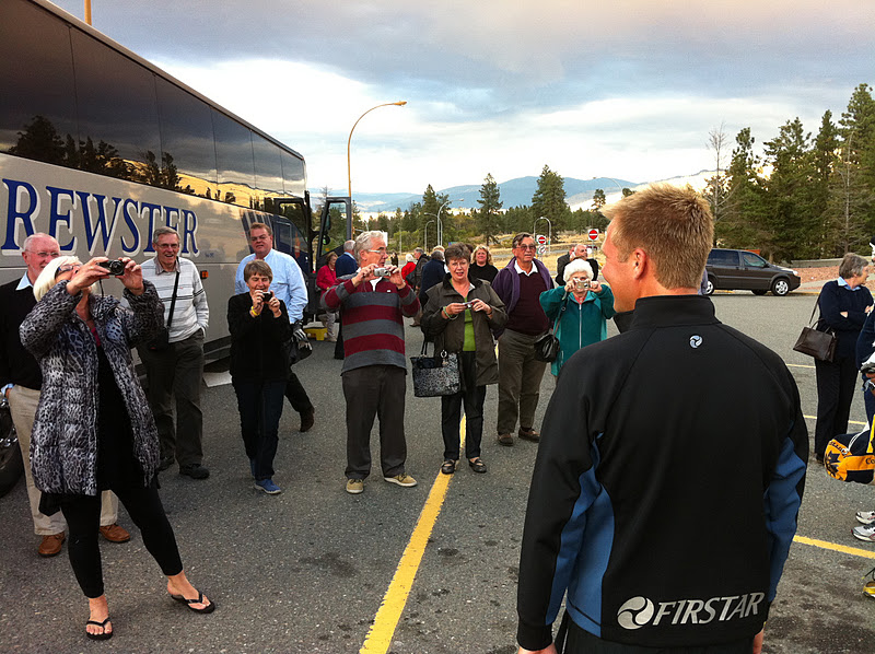 All 9 of us piled into the MCC and drove back to the visitor info centre to pick up Josh’s car and upon stopping were greeted by a bus load full of British tourists who came over to talk about the run. I was sitting in the MCC when I was told that I had to come out to meet some people. Some of the guys had been talking to the tourists about the run and when I came around the corner they just started taking my picture, but no one really asked me anything at first. It was kind of awkward and I felt a little like an animal at the zoo but I was tired and didn’t really know what to say. Eventually though we got a dialogue going and it wasn’t so strange.