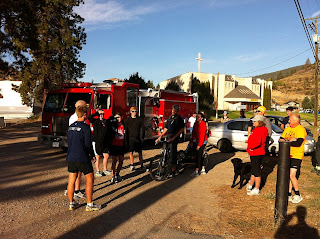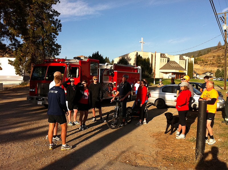 As a result Tyler had to get up pretty early this morning and was sleeping on the couch in our condo when I got up. We drove back to the start point and met Geoff and Jennay along with a bunch of their family and local firefighters. They escorted us all the way to their fruit stand, at which point they peeled off. At pretty much exactly the same time Kent and Dana pulled up and took turns running with Mike and I for about 30 mins; a great way to run out of Kelowna.