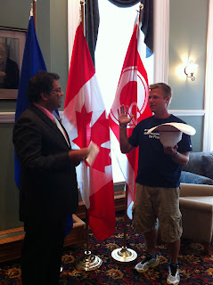 We all converged together at City Hall at 3pm where, along with the Hills, we met Calgary Mayor Nenshi. We had a quick chat and then Mayor Nenshi said that he had heard that the mayor of Thunder Bay had given me the key to the city and he didn’t want to get shown up. So he White Hatted me, Calgary’s version of the key to the city. He had me hold a white cowboy hat, raise my right hand, and after a quick oath and a loud “YAHOO” I was officially white hatted! Awesome!