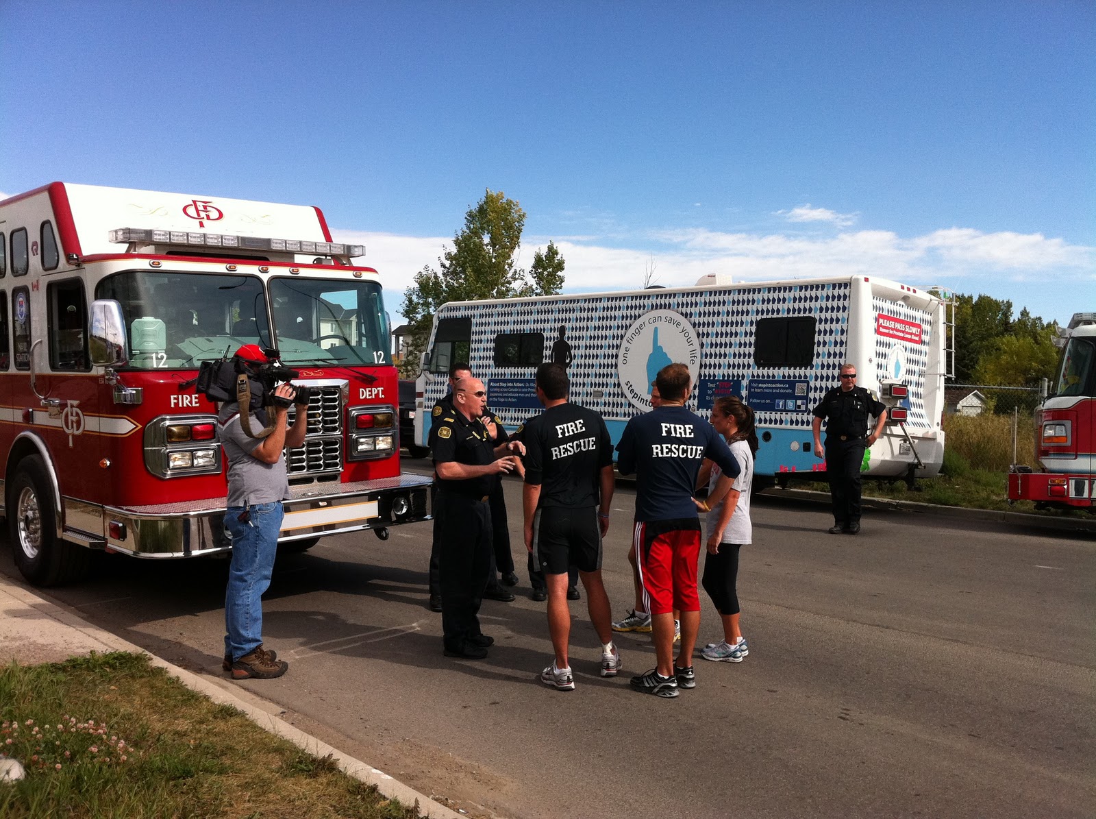 As we were nearing Chestemere, Russ’ friend Chris, a firefighter, came out and ran with us. A short while later a fire truck from Chestemere met us. We continued running through Chestemere and were joined by Mike’s dad and sister. That made five of us. As we approached the Calgary city limits a man with a video camera stepped out of the bushes and began filming us. He didn’t saw anything, just kept running beside us filming.